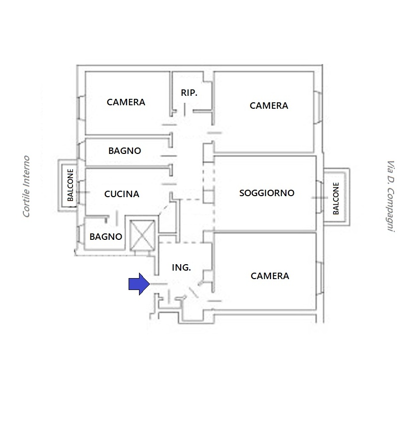 L’appartamento ha una superficie commerciale di circa 150 mq, è sito ad un secondo piano alto, ed è composto come segue: ingresso ampio, cucina abitabile con balcone sul cortile interno, tre ampissime camere da letto matrimoniali, un ampio salone con balconata su Via Dino Compagni, due bagni finestrati e vari ripostigli di cui uno molto grande che consentirebbe anche alla creazione di una spaziosa cabina armadio. Altezza soffitti 3,30 m.