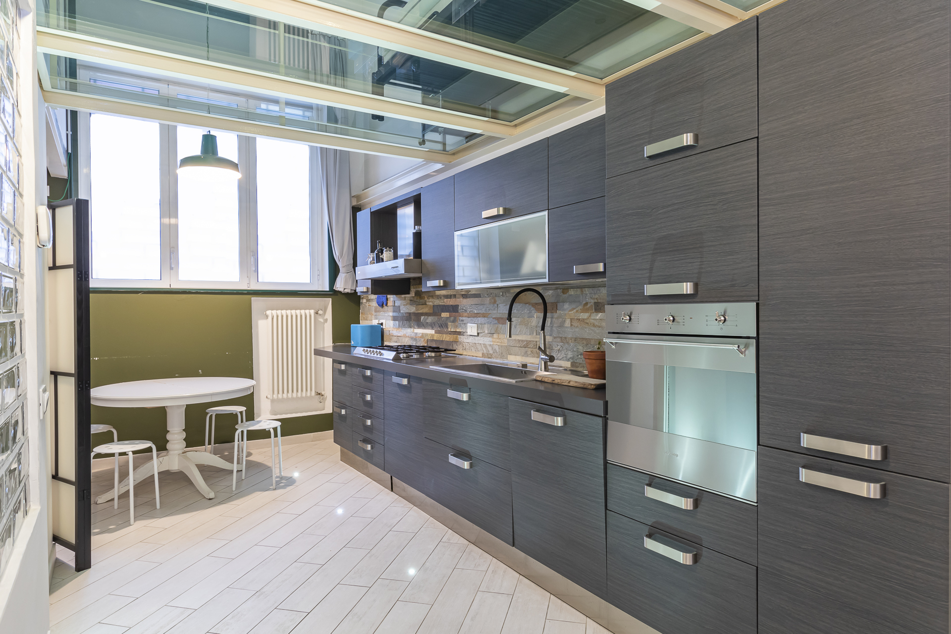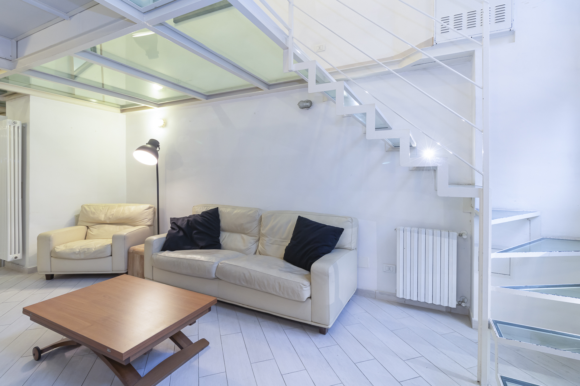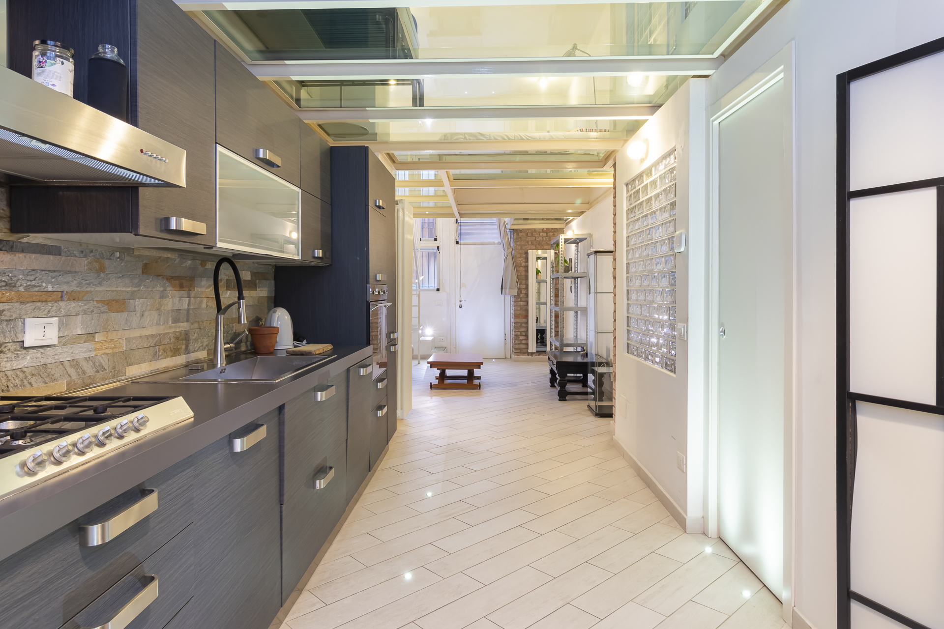 Elegante e con finiture ricercate: gres porcellanato come pavimentazione, splendida cucina di design completa di tutti gli elettrodomestici, incantevole bagno con piastrelle di ottima qualità, splendido soppalco con pavimentazione in vetro, cabina armadio con arredi in legno su misura al suo interno; l’appartamento gode di un’immensa tranquillità e silenzio pur essendo nel centro città, godendo dei suoi servizi e di tutte le sue comodità!